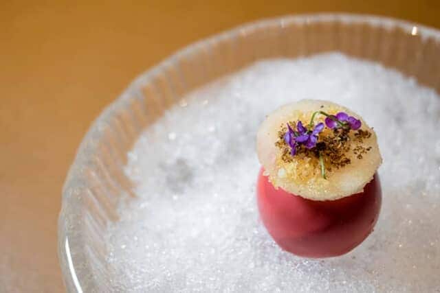 アミューズの「林檎 / 日本酒 / 山椒」は、想像を超える一品です。ビーツで染めた小さな赤い球体を優しく手でつまみ、一口で食べます。球体は口の中ですぐに割れ、ゾー・タン氏が大好きな青森林檎のジュ―スと日本酒があふれ、爽やかな果実の風味と甘味、酸味と共に、忍ばせたパチパチキャンディーが弾けて、口の中に驚きがワッと広がります。