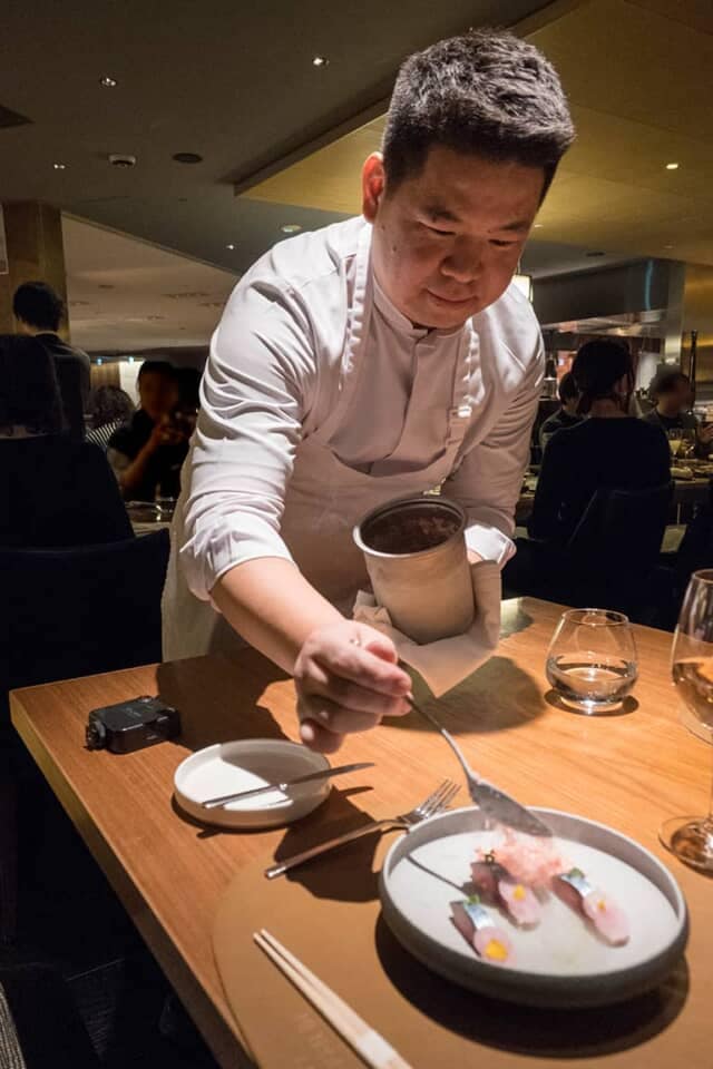 ▲ゾー・タン氏がテーブルで仕上げる「鯖 / 苺 / トマト」