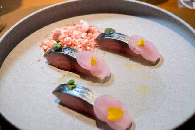 メニューを見ただけでは想像のつかない3品目「鯖 / 苺 / トマト」。鯖が3点並んだシンプルなお皿がテーブルに置かれると、ゾー・タン氏が自らテーブルをまわり、霜のついたアイスペールの中からフローズンの赤イチゴと白イチゴを添えていきます。