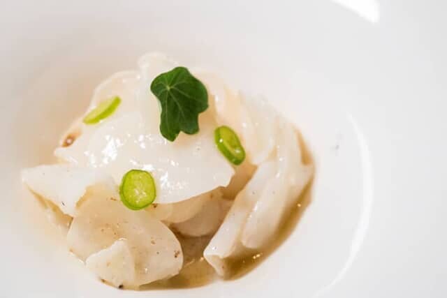 魚料理は「アンコウ / 玉木耳/ 発酵唐辛子」。青唐辛子の発酵調味料を詰めたアンコウの頭を蒸して、ソテーした玉木耳(白キクラゲ)が飾られ、再びゾー・タン氏がテーブルをまわってチキンストック(チキンブイヨン)を注ぎ入れて仕上げます。アンコウはふっくらと柔らかで、玉木耳はサクサクとソフトな食感。繊細な味付けの一皿です。