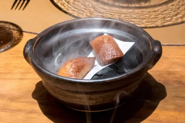 最後の一品はスモークされた「焦がしバター フィナンシェ」。蓋をした器で運ばれ目の前で開けると炭の香ばしい香りが立ち昇ります。デザートワインと共に頂くのも本格的。フォンセカ・ギマラエンスの「フォンセカ エイジド・トーニー・ポート10年」を合わせます。甘口の赤ワインはブランデーの香りも感じられる深い味。香ばしいフィナンシェとポートワインのマリアージュを満喫しました。