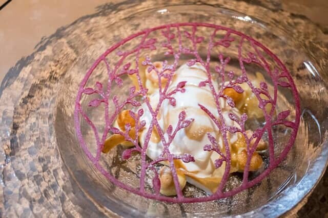 繊細に飾られたデザートも、ドラえもんのしずかちゃんが美味しそうに食べる焼きいもをヒントにした「サツマイモ / 烏龍 / 雪塩」。ウーロン茶のクリームや雪塩を使ったアイスクリームに、日本産のサツマイモのさまざまな食感が楽しめるように、ピューレやサブレなどが添えられます。特に雪塩が、サツマイモの甘味を引き立てます。