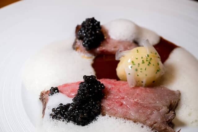 子供の頃から『ドラえもん』が大好きだったというゾー・タン氏。しずかちゃんが座る座布団からインスピレーションを得て、牛肩ロースの希少部位 “ざぶとん” が使われます。刺しが入った牛肉は柔らかで、牛の出汁だけで作られたブラウンソースに加え、麻辣を泡状にした香りづけのソースを周囲に飾り、ゾー・タン氏自家製の塩分を抑えたキャビアが添えられる贅沢さ。軽めのソースで肉の旨味とキャビアの風味を同時に味わいます。