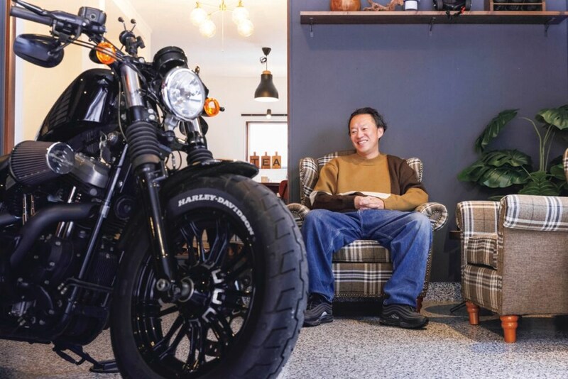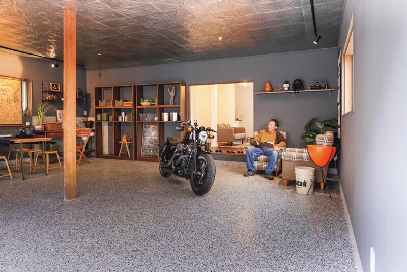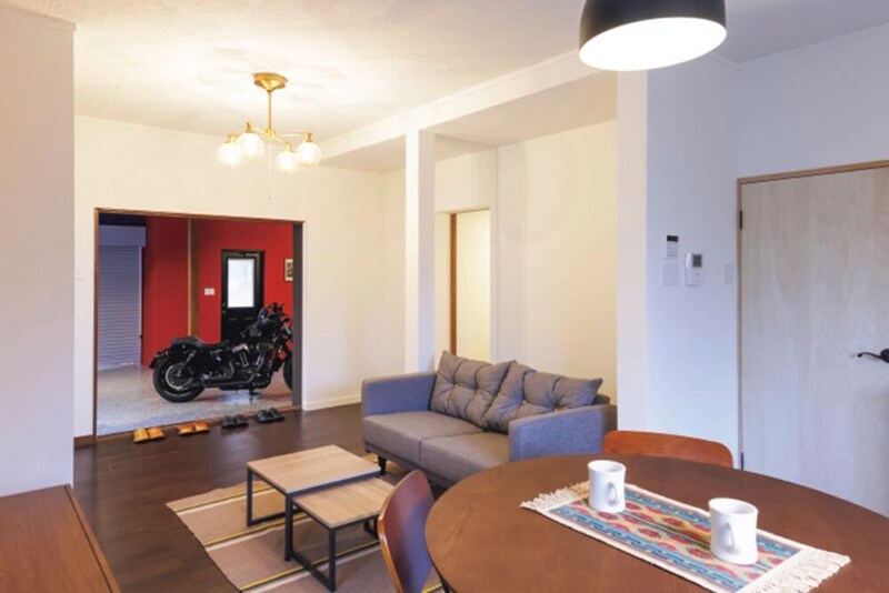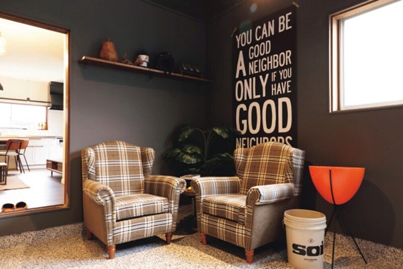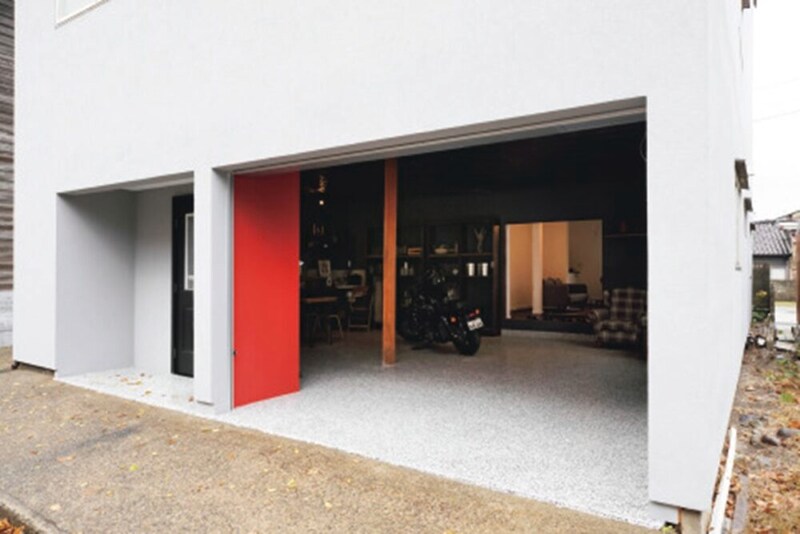 初見の感想は「本当に同じ場所?」だった。まず外壁は旧さが際立つものだったが、塗り壁材「ソーイ」を塗ることでモダンな印象となっている。さらに中へ入ると、壁はグレーの漆喰塗料「カルミュール」で塗装、床は樹脂でフレークを固めた床材「ポリフレーク」が敷き詰められ、天井は柄入りのプレート「ティンパネル」を貼ることで、殺風景だった車庫スペースはイメージ激変! さらにソファや棚、水場などが設置され、ガレージとしても、リビングとしても機能する、魅力的な空間に仕上がっている。