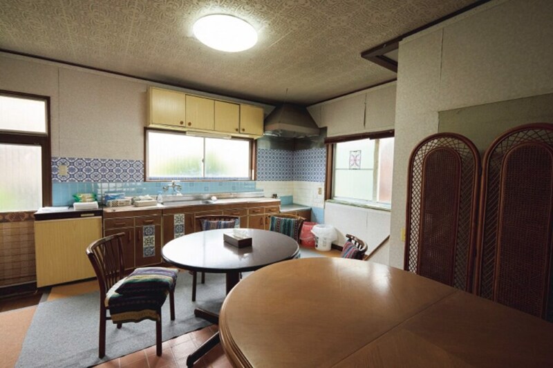 昭和な雰囲気が漂う台所が現代的なキッチンに。剥がれかけた壁紙を取り払い、漆喰塗料で壁を白に塗り上げた。木の質感も相まって、温かみのあるダイニングキッチンに仕上がっている。