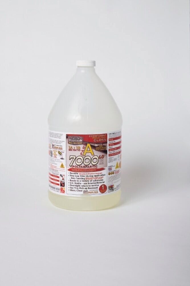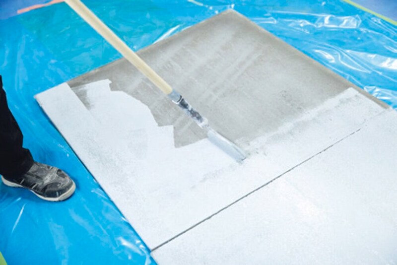 ポリフレークの施工に使う樹脂材。耐摩耗、耐薬品、UV耐性がある材料で、施工の自由度が高く安全性も高い。