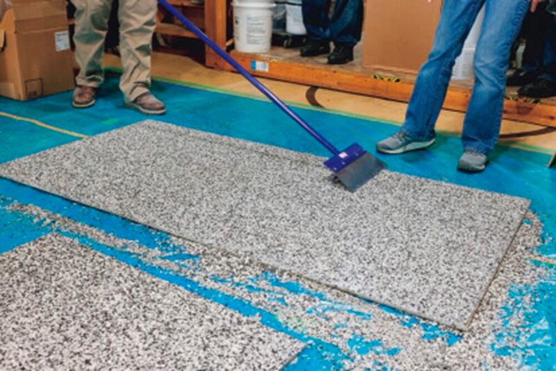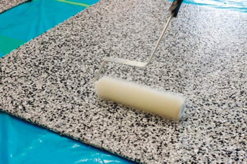 床にベースコートを塗り、その上にフレークを投げ上げるようにして撒く。乾いたらスクレーバーで余分なフレークを取り、トップコートを塗れば完了。