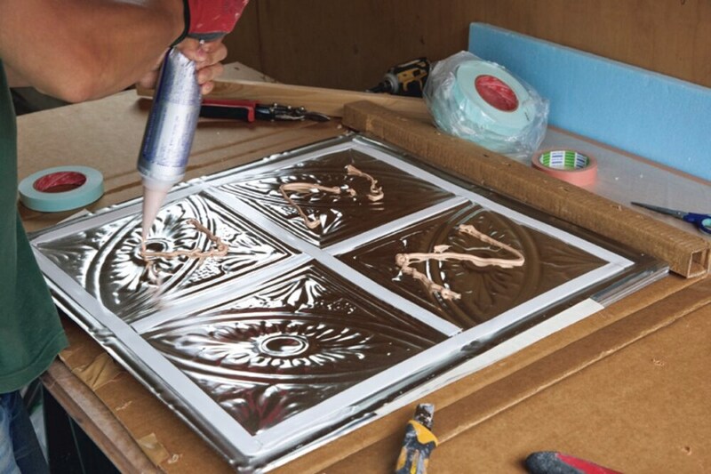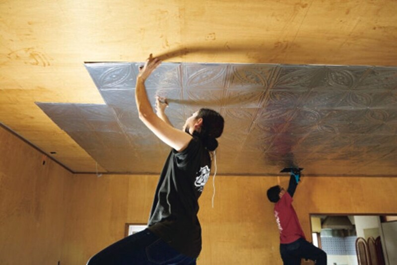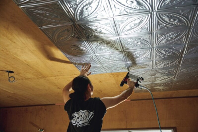 ティンパネルは手軽に施工できるのが特徴。壁や天井に施工する場合、接着剤などで仮止めし、フィニッシュネイルで固定するだけ。