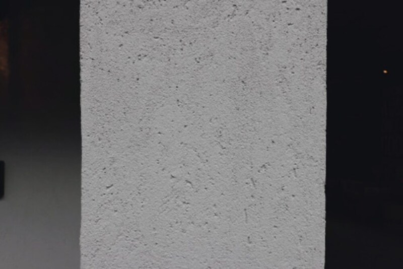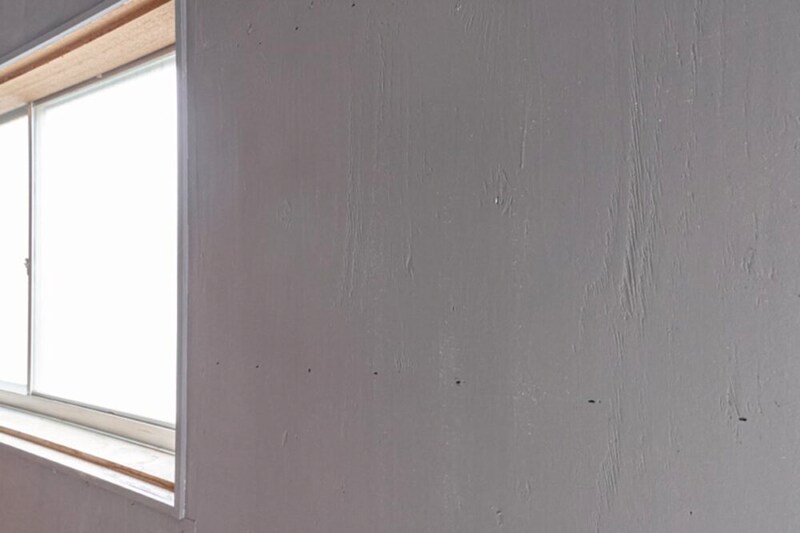 ガレージスペースのべニア壁にカルミュールをローラーを使って塗った。左官のような質感に仕上がっている。