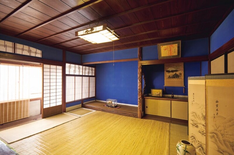 和室の柱や梁はそのままに砂壁の上から青色のカルミュールを塗ってイメージチェンジ。床は畳敷だったものをフローリングにして和風の洋室に仕上げてある。