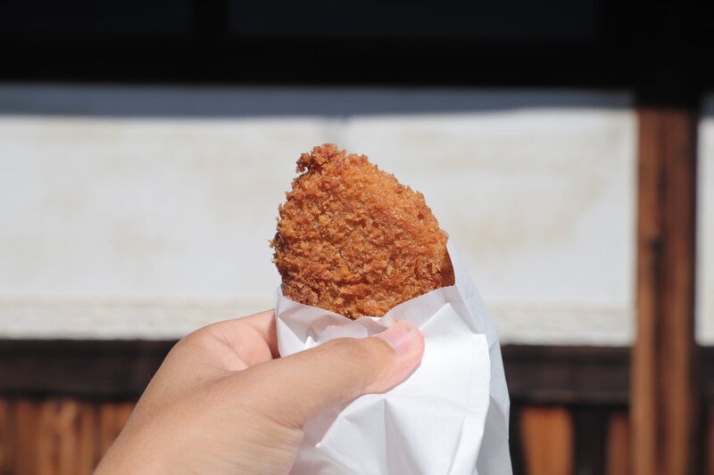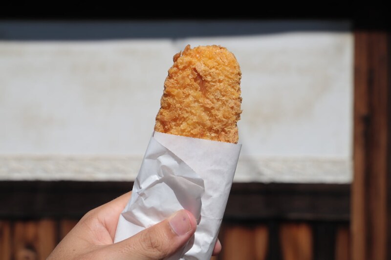 御所市櫛羅地区の男爵イモを使ったコロッケは熱々のホクホク、ジューシーな脂ととろけるチーズがマッチしたササミチーズカツもおすすめ。塩を振って食べるとなおおいしい……!