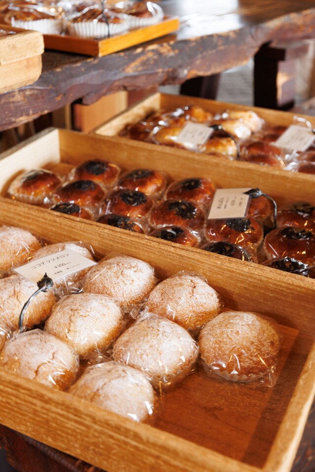 店内に一歩足を踏み入れると、木箱いっぱいに焼きたてのパンがずらりと並びます。ハード系を中心に40~50種ほどをそろえるパンは、国産小麦を使い、できる限り地元の素材にこだわってつくられた、ここでしか味わえない逸品たち。お店のすぐ隣には無農薬でキンカンやブルーベリー、ハーブなどを育てており、これらもパンづくりに生かしているそうです。