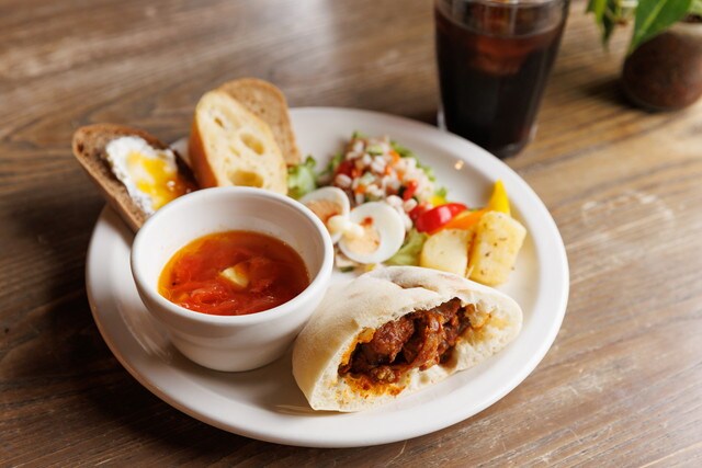 写真の「ランチプレート」は、黒こしょうがきいた爽やかな酸味が楽しめるラッサムスープ、なすびのカレーピタサンド、押し麦サラダ、じゃがいものソテー、3種のパン、そしてドリンクが付いた一番の人気メニューです。