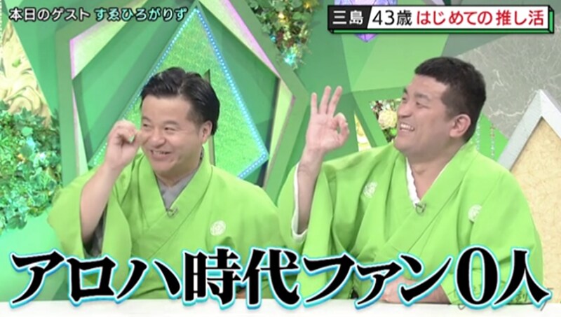 そんな三島にともこは、「すゑひろがりずのファンの人だって、『(昔は)アロハ着ていたのに(今は)キレイな着物着て、染まっていったな』って」とニヤリ。この発言に三島と相方の南條庄助は声をそろえて、「アロハ時代のファン、ゼロです!」とツッコんだ。「よく知っていますね!」「誰もガッカリしていない!」と続けて、スタジオの笑いを誘った。