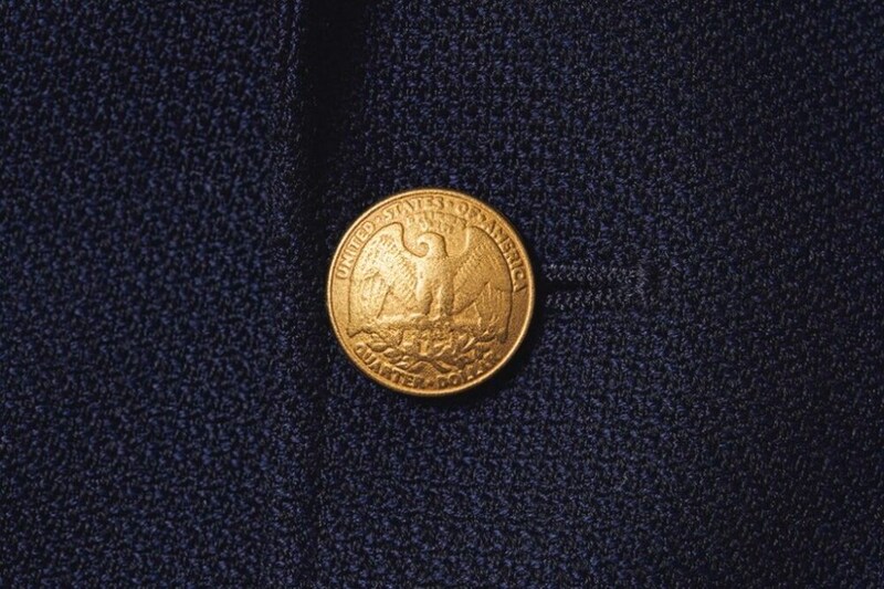 構築的なのにアメリカンな印象を残すディテール使いこそカジュアル&ドレスを行き来できる秘訣。ボタンにはワシ!