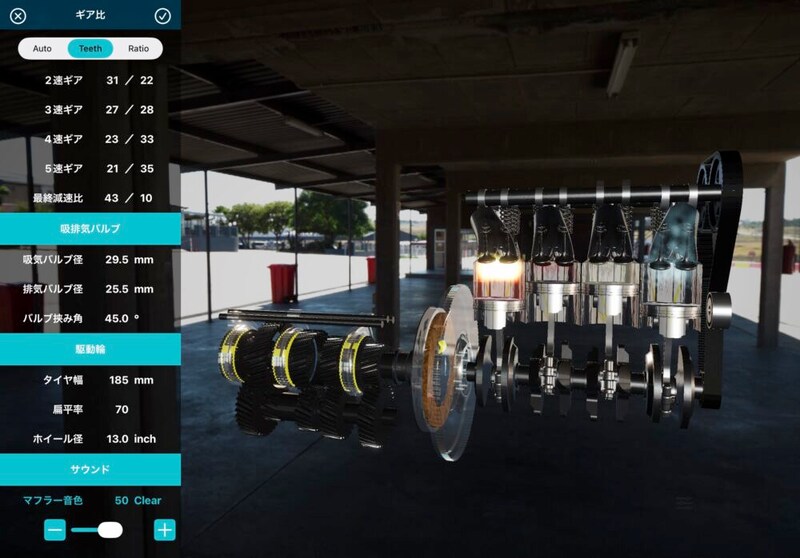 エンジンの回転数は、回転計を指で操作するか、iPad/iPhoneを傾けることで、スロットル操作をすることで操作することができる。ギアもギアパネルでタップすることで操作できる。すると、そのエンジンの回転数に応じて、それなりにその車種っぽい音がするのだ。