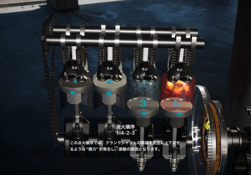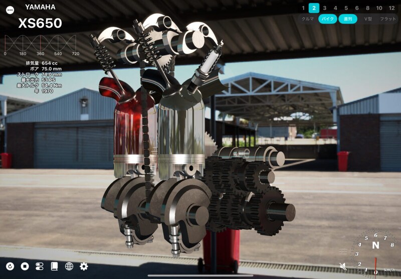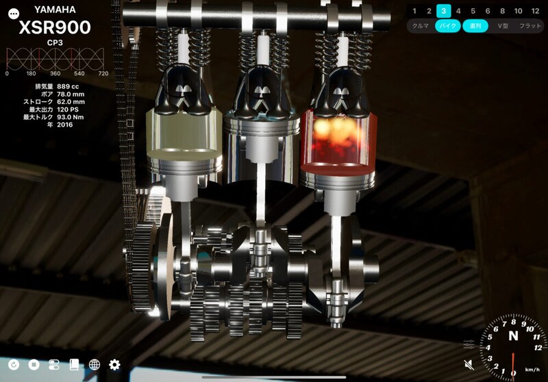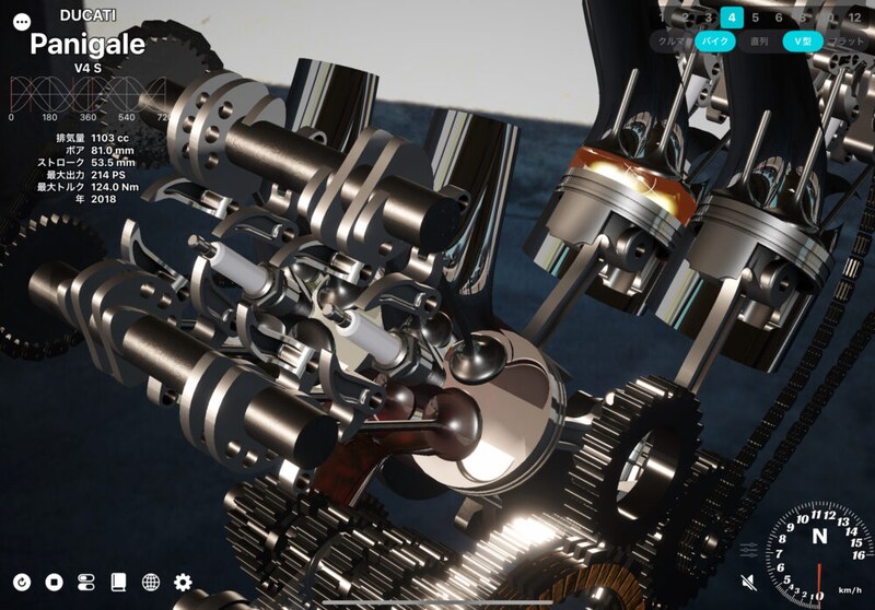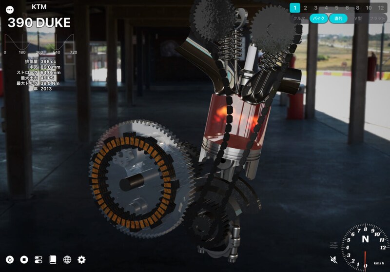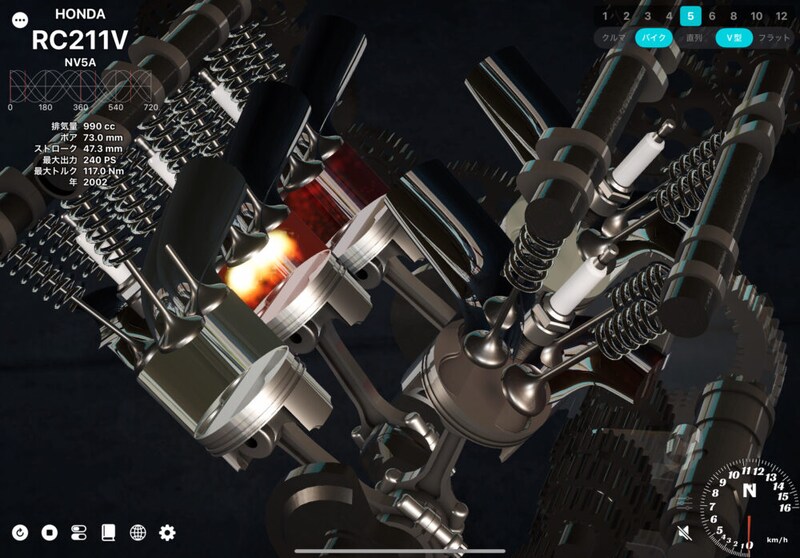バイクにはホンダが作ったレーシングマシンのRC211Vが、V型5気筒という特殊なエンジン形式なのだが、Trans4motor Rではこれも再現されている。これは4気筒と5気筒はレギュレーション上の制限重量が同じという隙を突いた特殊なバイクで、後ろバンクの2気筒をフレームの間に挟み込んで、V型4気筒並みのスリムさに5気筒のパワーを組み合わせたエンジンなのだが、Trans4motor Rではその爆発間隔がどうなっているかなども見ることができる。ちなみに、もちろん筆者は乗ったことはない(笑)