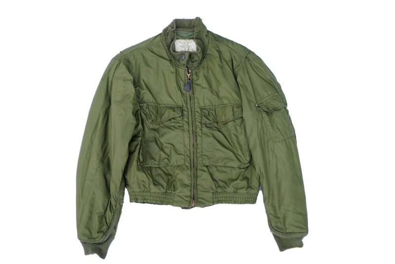 ワイドシルエットで極端に着丈が短いのは、操縦席に座った状態でも動きやすいように配慮されているからだろう。今回見つけた70年代のヴィンテージはロング丈の仕様であるがそれでも短く、「MA-1」などと似ている。さらに座った状態でもストレスなく動きやすいように背面にはアクションプリーツを配している。また、フロントの大きなポケットはグローブをしたままでも出し入れしやすい大きさかつ、収納したものが落ちにくい構造となっているため、パイロットは言わずもがな、ハーレー乗りでもメリットを多く感じるディテールが採用されている。
