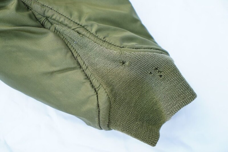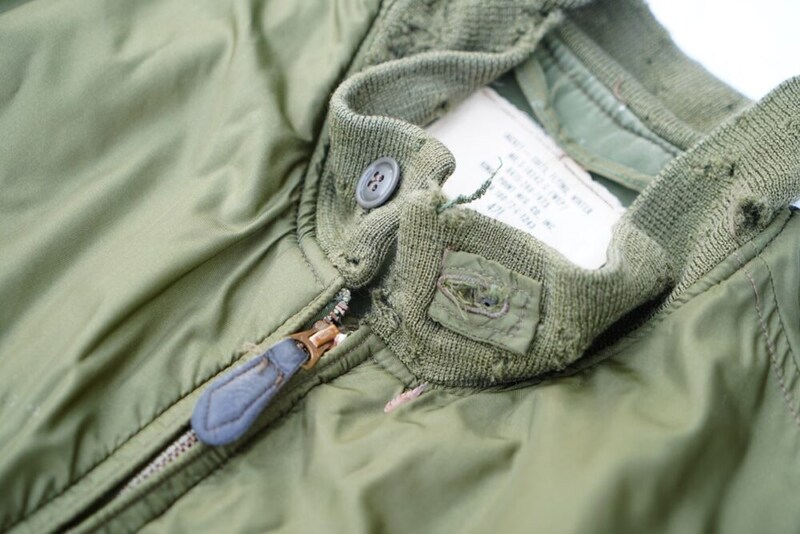 米軍のフライトジャケットでは珍しいリブのスタンドカラーが採用されている。さらにチンストラップも付いているので、保温性も確保。ウール製なので暖かいが、この個体のようにダメージがあるケースが多く、完璧なコンディションを求めると、それだけプライスも高くなる。