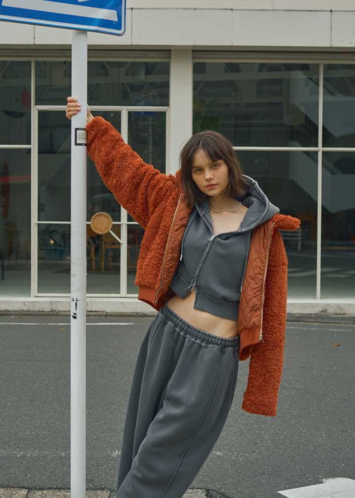 「ダブルジップピグメントショートパーカー(13,200円)」と「ピグメントスウェットルーズパンツ(14,300円)」のセットアップに、「ボアショートブルゾン(22,000円)」を合わせれば、温かさと可愛さを兼ね備えた旬の冬スタイルが完成♪
