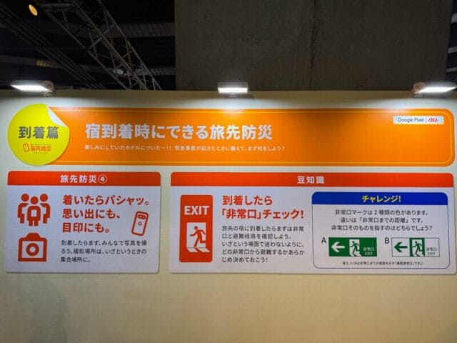 こちらは、旅先別に知っておきたい防災のコツの展示コーナーです。