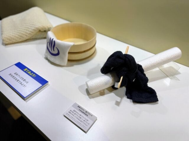 温泉へ旅行しているときにケガをした場合に、タオルと歯ブラシでできる止血方法も展示されていました。