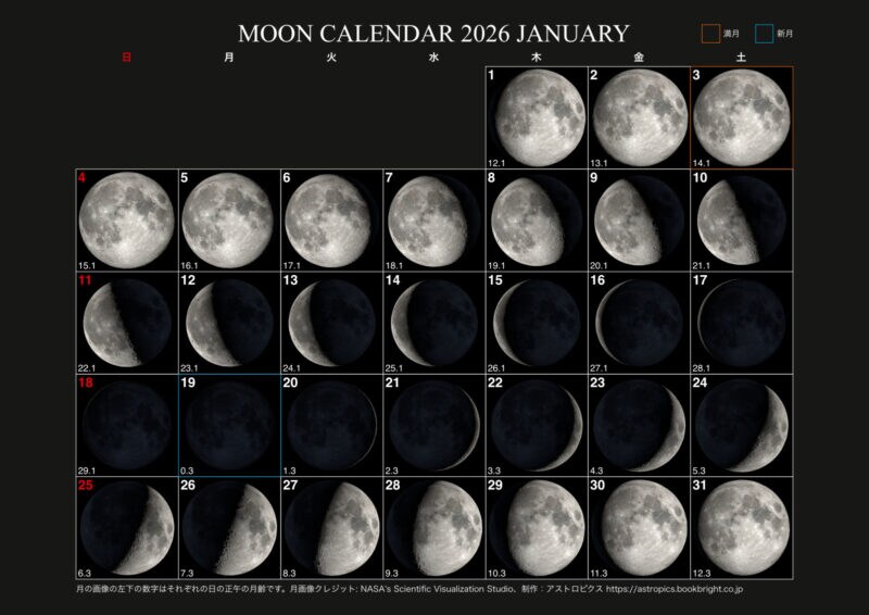 アストロピクスでは先日、2026年の1年間の月の満ち欠け(月齢)のカレンダーを掲載しました。今回紹介するのは、編集部で作成した2026年1月の月の満ち欠けカレンダーです。1年分のカレンダーと比べ、月の大きさの変化などが見やすくなっています。