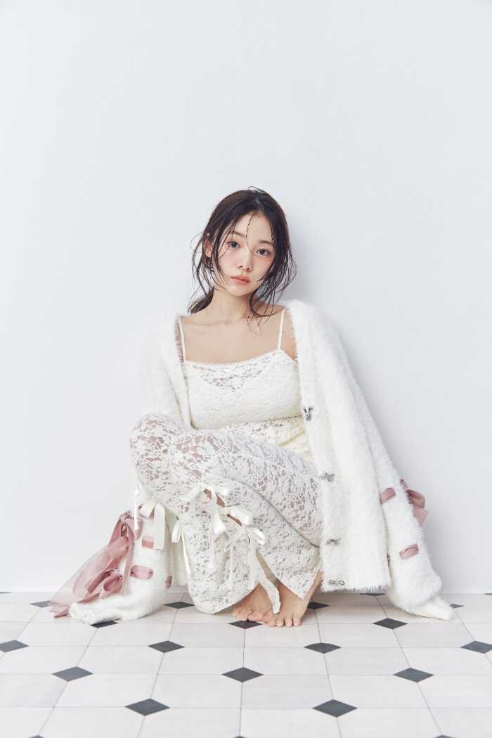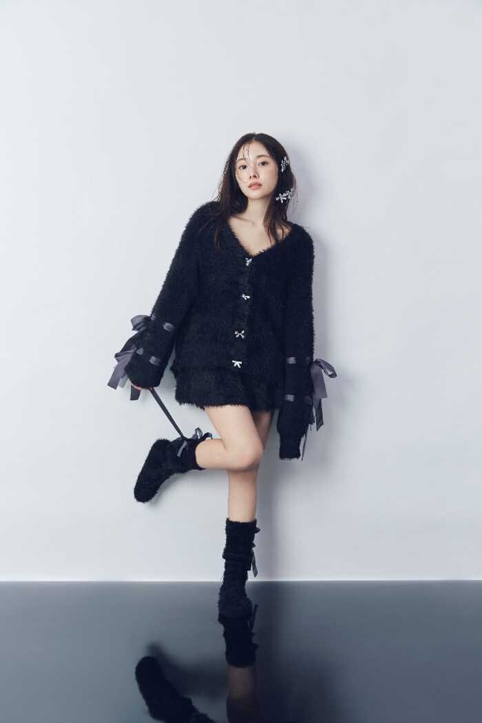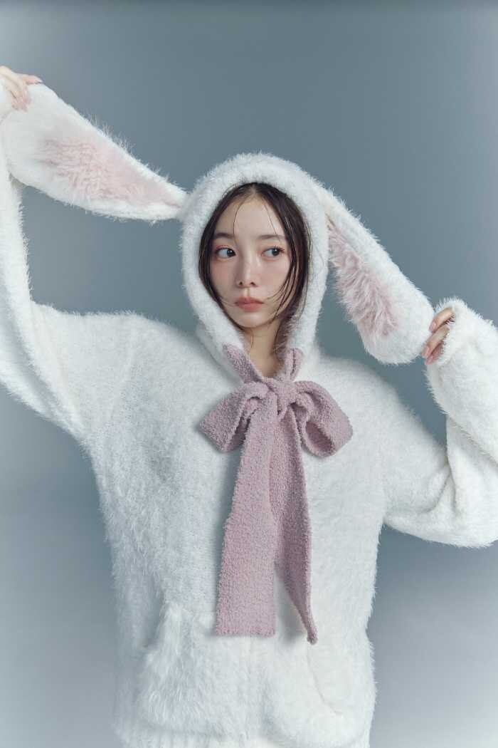 ふわふわ素材と耳付きデザインが魅力のニットシリーズは、白ウサギ(WHT)と黒猫(BLK)がモチーフ。