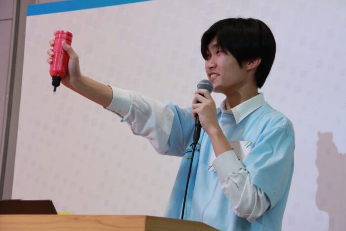 1チーム目は、都立新宿山吹高等学校「東京お助け隊」が、行き先案内・観光提案、音声チャットAIなど、複数の機能を搭載したスマートグラスのシェアリングサービスを提案。