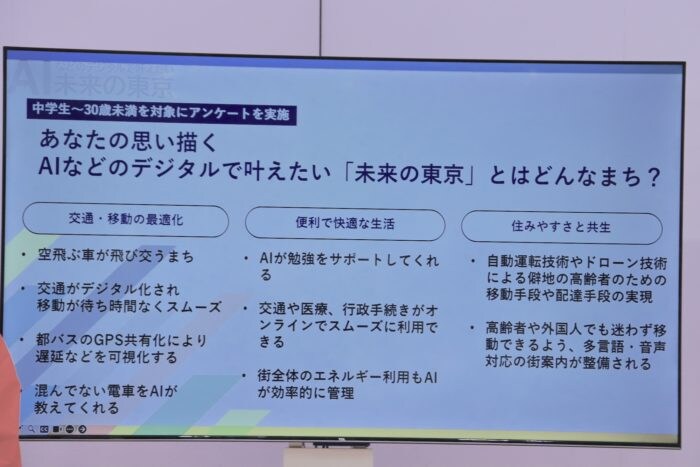 2025年は「AIなどのデジタルで叶えたい『未来の東京』」をテーマに、都内4つの高校の代表生徒らから、未来の東京についてのアイデアが発表されました。