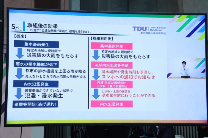 1人で登壇した本チームは、都民を内水氾濫から守るための、AI予測による統合的な防災システムを提案。