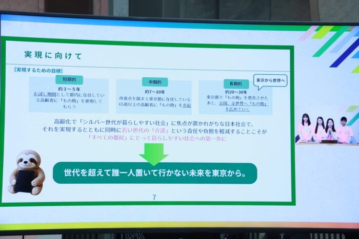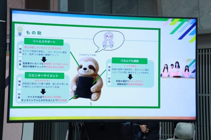 そして最後の4チーム目、東京学芸大学附属国際中等教育学校「Crossroad Tokyo」は、高齢者の孤立世帯の増加、健康・生活課題のサポートを目的としたAI搭載ロボット「もの助」を提案。
