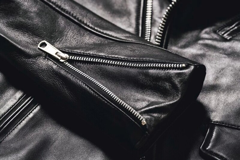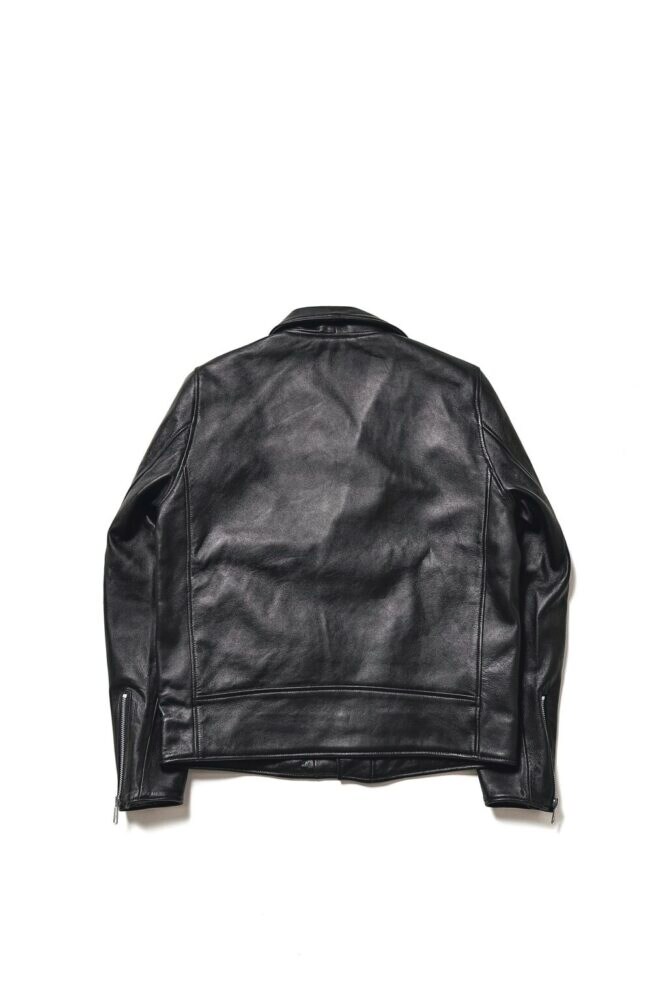 1950年代に見られる王道のライダースジャケットをモチーフにしたモデル。袖口は定番のジッパー仕様で、背面は贅沢に一枚革を使用している。素材にはしなやかな軽量のラムスキンを使用しており、革ジャン初心者の方でもストレスなく着用することができる。アクションプリーツがないため、着てみると身体にフィットして非常にスタイリッシュ。とはいえ、袖付け部分のパターンを改良しているため、前傾姿勢も取りやすい。48,000円