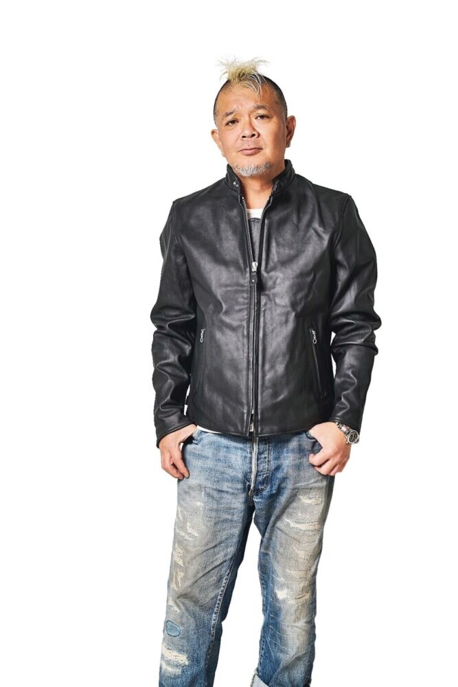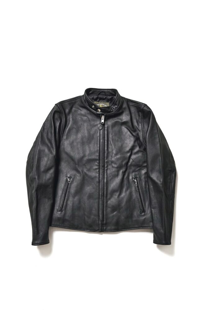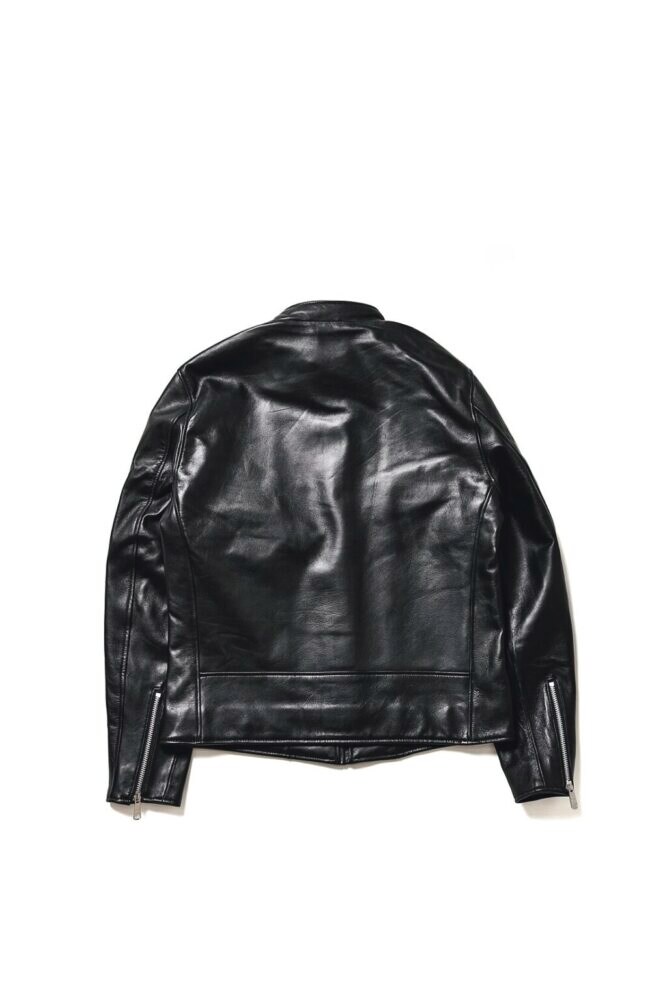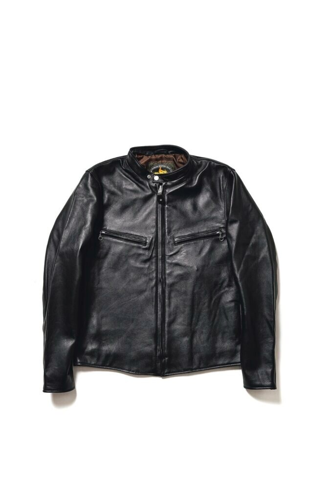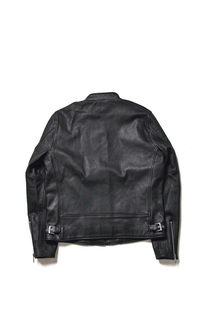 シャープな印象のスタンドカラーのシングルライダースジャケット。両サイドにはジッパー付きのスラッシュポケットが装備され、機能性も高い。春や秋にはアウターとして、そして冬にはこの上にダウンジャケットやコートを着用して、インナーとしても活用できる汎用性の高さが魅力だ。マテリアルは厚みのあるカウハイドを採用。58,000円