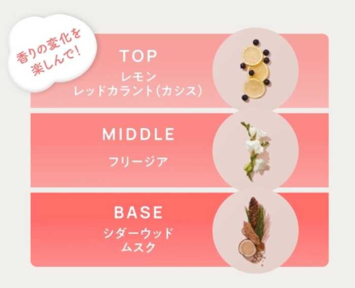 シャンプーを泡立てた瞬間に広がるのは、地中海レモンやカシスの爽やかな香り。その後、華やかなフリージアの香りへと変化し、最後はシダーウッドとムスクのウッディな甘さが余韻を残します。