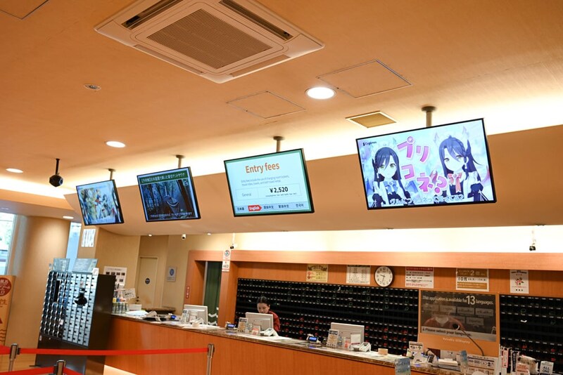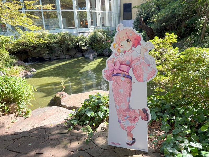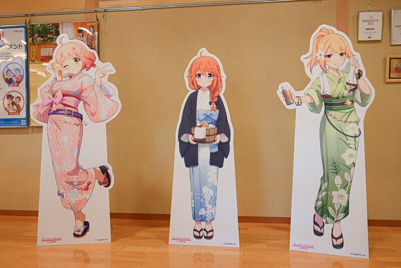 靴をロッカーに預けて、さっそく館内へ。入口では上記で紹介したコラボ手ぬぐいのサンプルが置かれているほか、浴衣姿のユニ、チエル、クロエのパネルも。フォトスポットになっているので、ぜひ撮影しておこう。