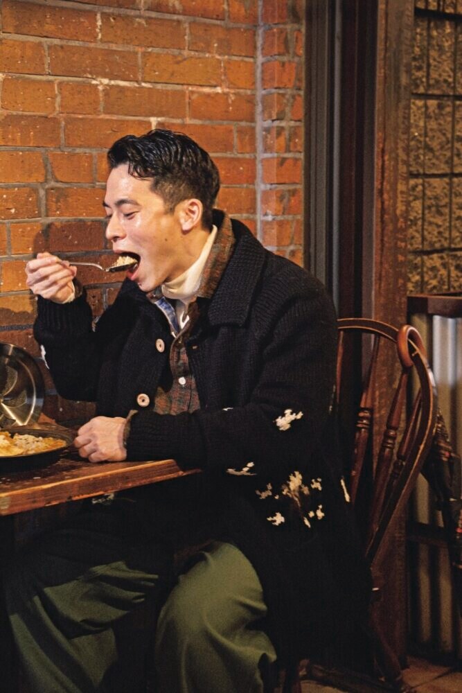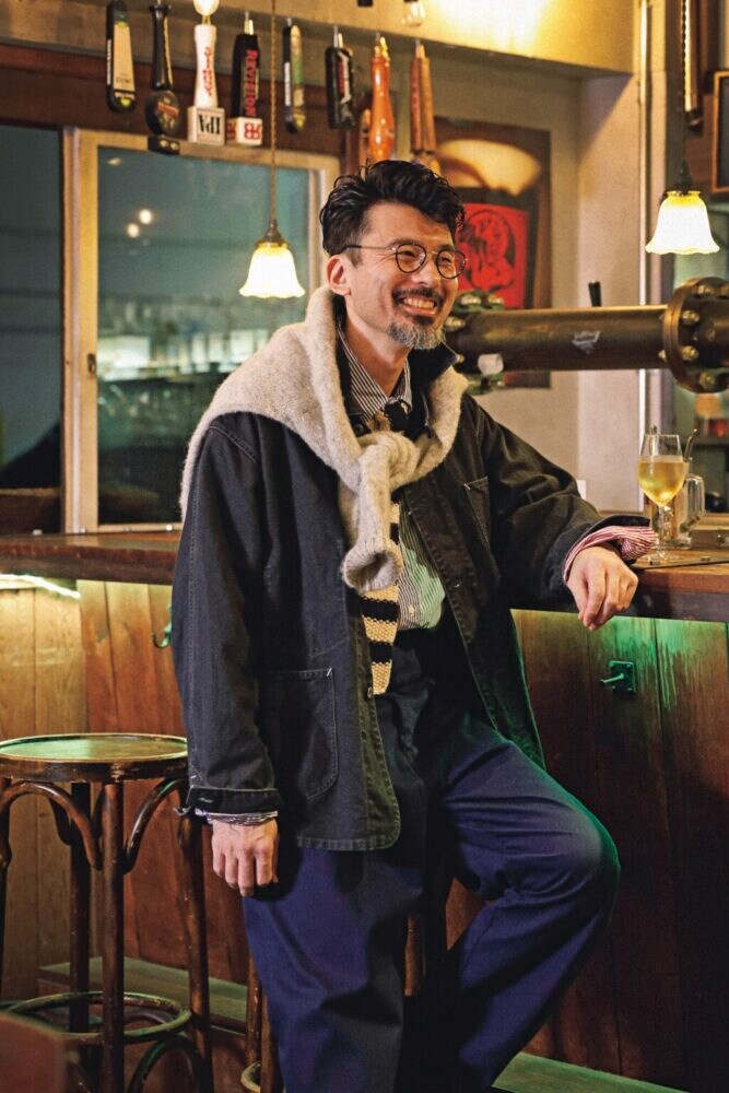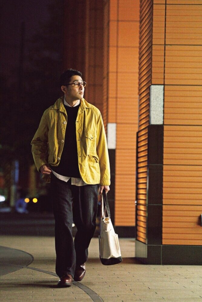 ニット3万9600円/スローン(ザ ショップ スローン 自由が丘TEL03-6421-2603)、デニムパンツ5万5000円/ヘリル(にしのやTEL03-6434-0983)、ジャケット5万1700円/コロナ(バクTEL03-6300-5043)、シャツ2万5300円/コーディングス(真下商事TEL03-6412-7081)、シューズ10万8900円/エンジニアド ガーメンツ × ジョセフ チーニー(エンジニアド ガーメンツTEL03-6419-1798)、メガネ3万9600円/アーチ・オプティカル(コンティニュエTEL03-3792-8978)、トートバッグ4万700円/ウティ(にしのや)