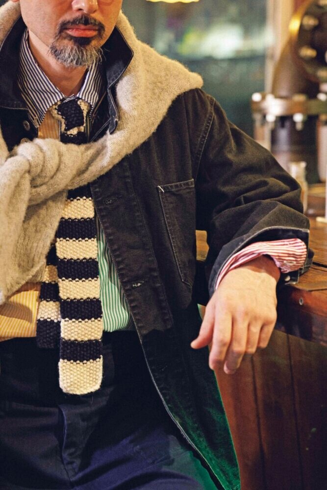 カバーオール(ポストオーバーオールズ中目黒TEL03-6303-2160)、BDシャツ1万7930円/サウスウィック ゲートレーベル(シップスインフォメーションセンターTEL0120-444-099)、ニットタイ7920円/ブラックシープ(Pt.アルフレッドTEL03-3477-7952)、肩に巻いたシャギードッグセーター3万3000円/J.プレス オリジナルス(J.プレス & サンズ 青山TEL03-6805-0315)