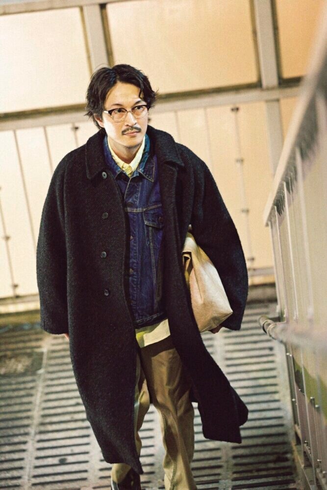 バルマカーンコート14万8500円/オールドジョー(オールドジョー フラッグシップストアTEL03-5738-7292)、デニムジャケット5万3900円、チノパンツ3万7400円/ともにシオタ customerservice@ciota.jp、BDシャツ4万4000円/インディビジュアライズドシャツ(メイデン・カンパニーTEL03-5410-9777)、シューズ9万6800円/パラブーツ(パラブーツ青山店TEL03-5766-6688)、メガネ4万7300円/ステディ(G.B.ガファスTEL03-6427-6989)、バッグ3990円/ムジラボ(無印良品 代官山TEL03-5422-3250)