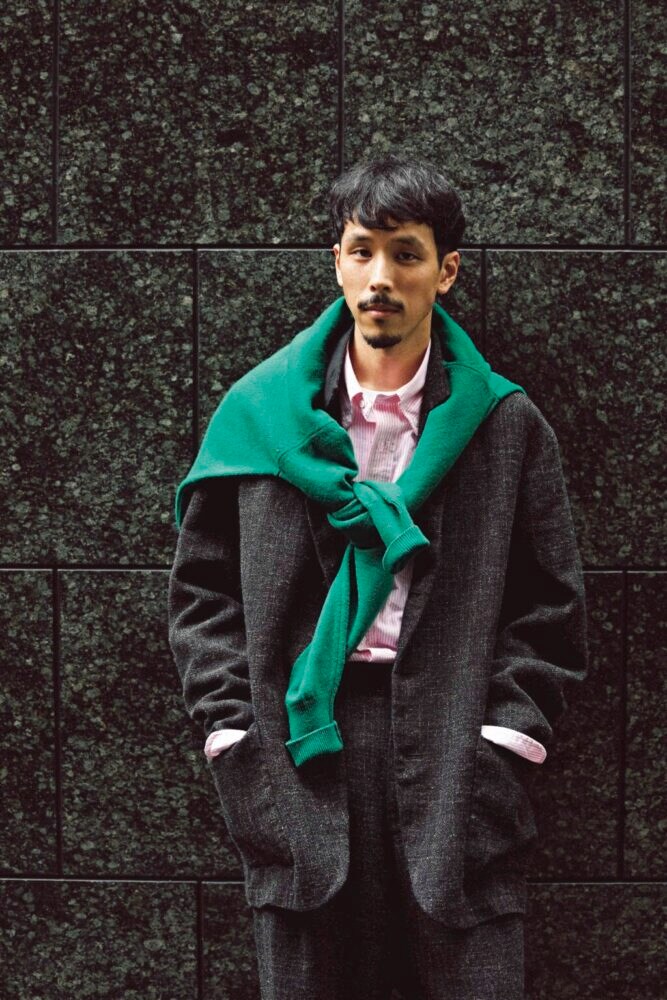 ジャケット6万6000円、同素材のトラウザーズ4万9500円/ともにコンフェクト(コンフェクト 表参道店TEL03-6438-0717)、BDシャツ1万1220円/バギー(メインTEL03-3264-3738)、肩に巻いたセーター8万300円/ヘリル(にしのやTEL03-6434-0983)