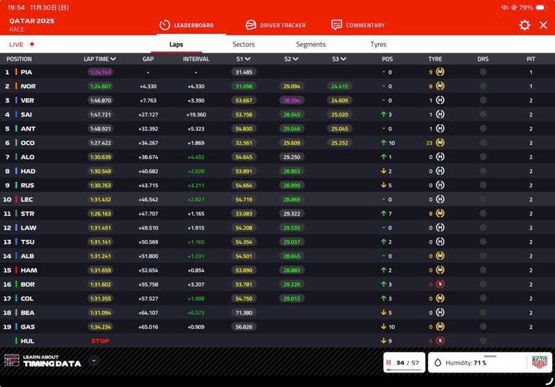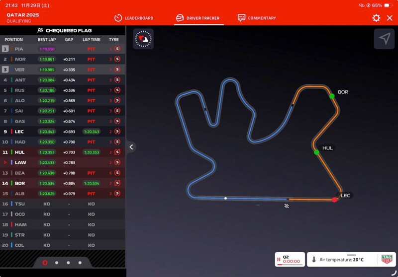 コースは3つの『セクター』という区間に区切られており、そのセクターごとに色が表示される。第1セクター、第2セクターをパープルで来たら、全体ベストタイムを獲得できる可能性が高いから、「第1、第2セクター、パープル!」と言われると、F1ファンは自動的に鳥肌が立つようになっている(笑)