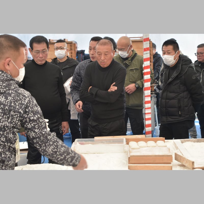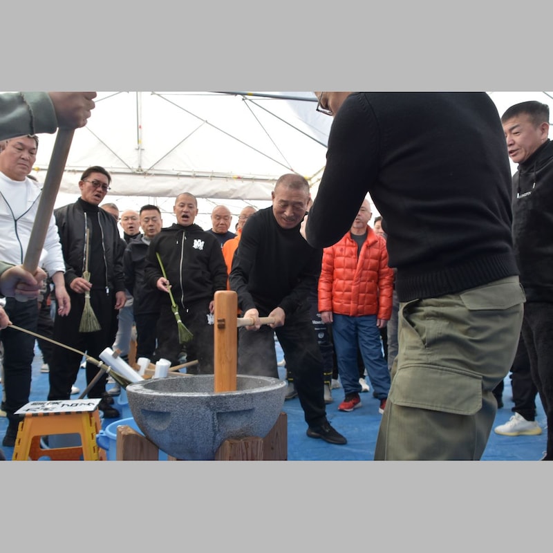 席に着いた司組長の手元には、立派な漆塗りの椀で組員たちがついた餅が入った雑煮が運ばれた。しばらくは餅つきの様子を眺めながら、雑煮に舌鼓を打つ司組長。するとおもむろに立ち上がり、テント内の調理係や蒸し器担当、餅の成型係に歩み寄り、声をかける。ぐるりとテント内を1周したのち、直系組長たちが担当する1台の臼に近づき、杵を手に取った。そして生野靖道若頭補佐(四代目石井一家総長)、加藤徹次若頭補佐(六代目豪友会会長)と3人で臼を取り囲み餅をつき始めたのだ。