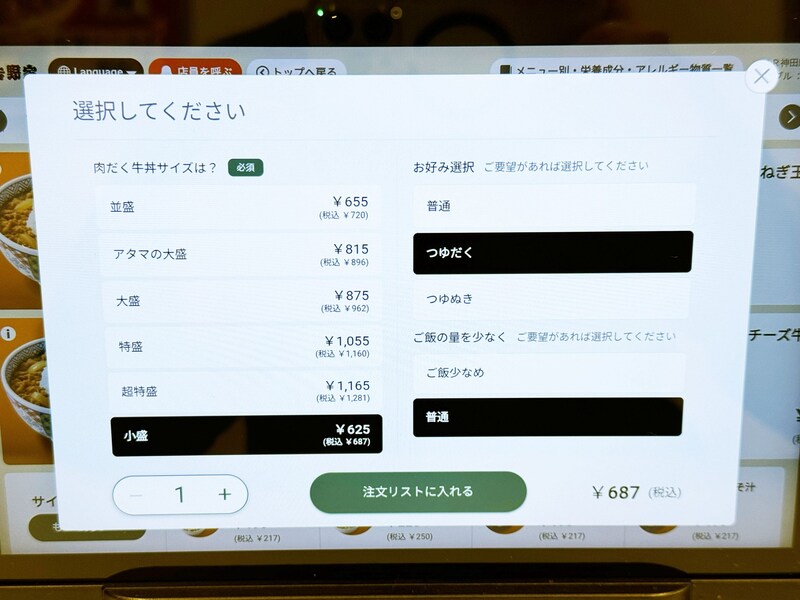 タッチパネル式の店舗でもツユダクを指定可能です。