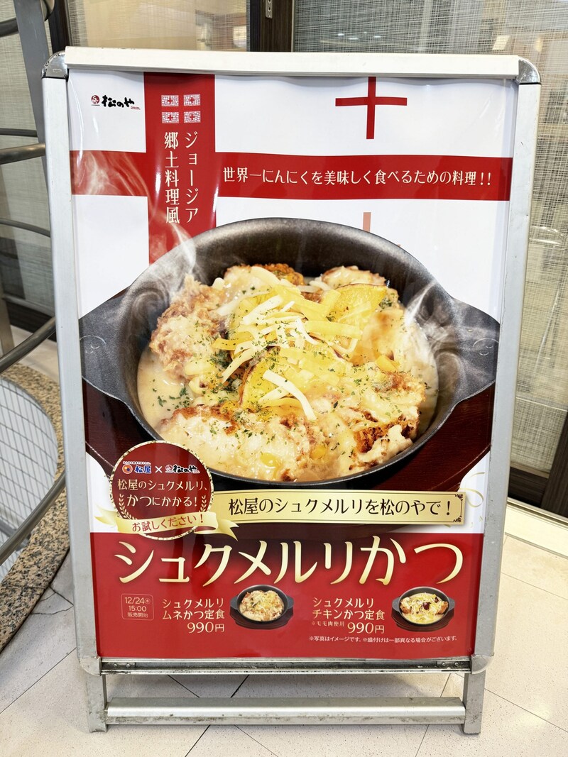 そんな松屋のシュクメルリは、期間限定で販売される特別メニュー。よって、販売されていない期間もあるのですが、なななんと、松屋の姉妹店「松のや」の一部店舗で復活。あの味を楽しめるのです! しかも、チキンカツ化したシュクメルリが食べられるのです!