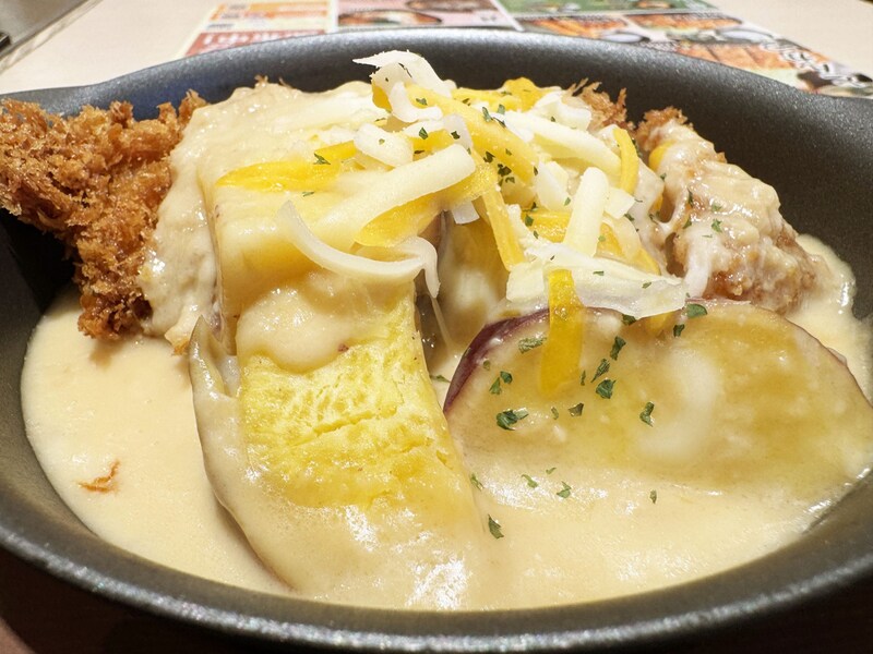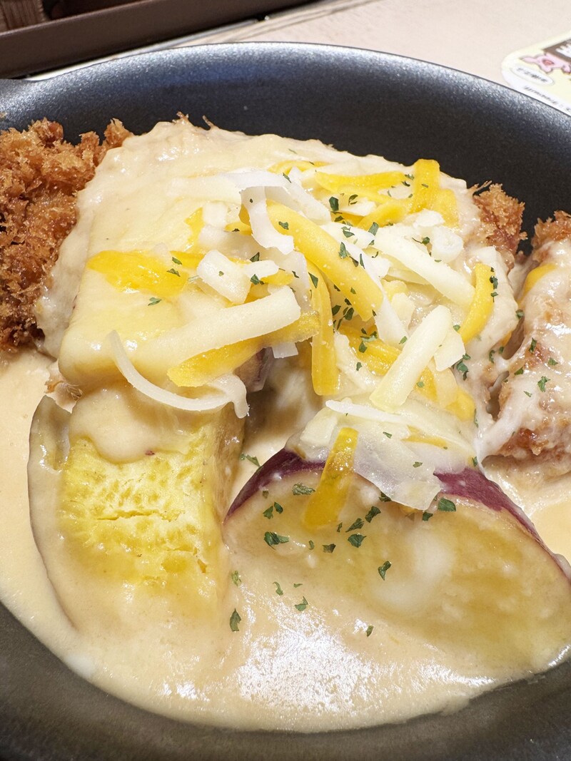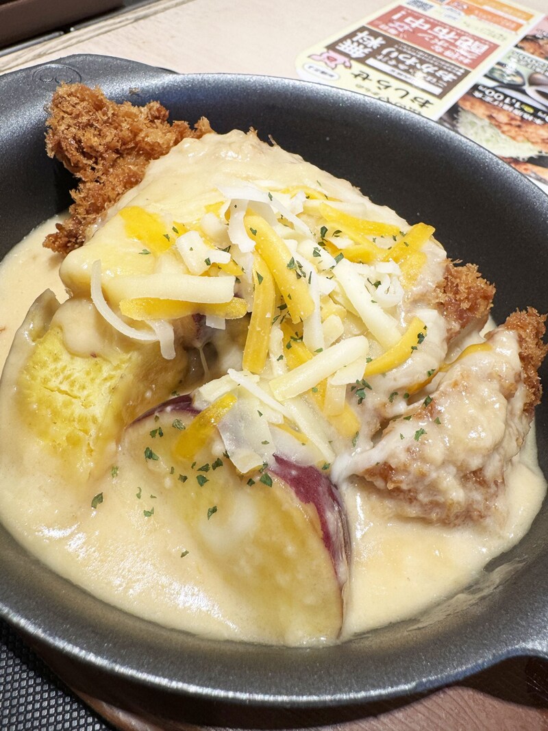 チキンカツとサツマイモがシュクメルリソースとチーズに埋もれています。