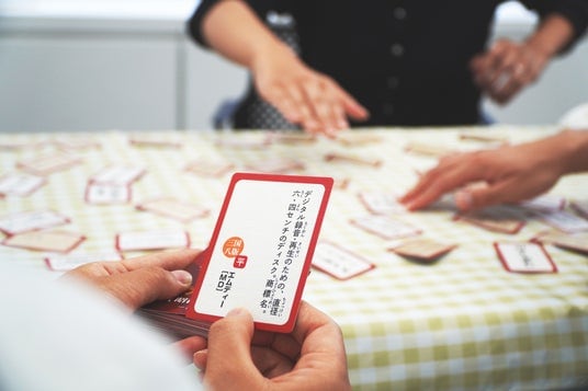 取り札には、同書が刊行されたタイミングで新規に追加された項目から、主に令和期に広まったことば50語が選ばれています。読み札に書かれた文章から、取り札を集めてください。