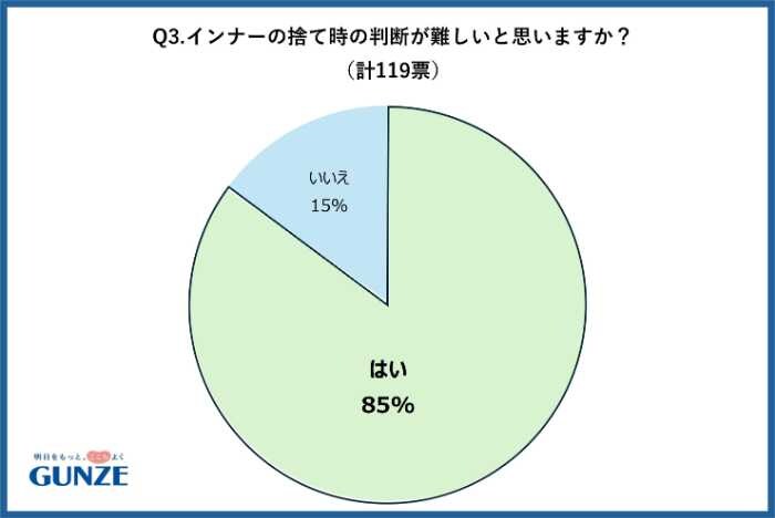 さらに、長く着すぎてヨレたインナーを持っている人は72%、捨て時の判断が難しいと感じている人は85%にものぼりました。