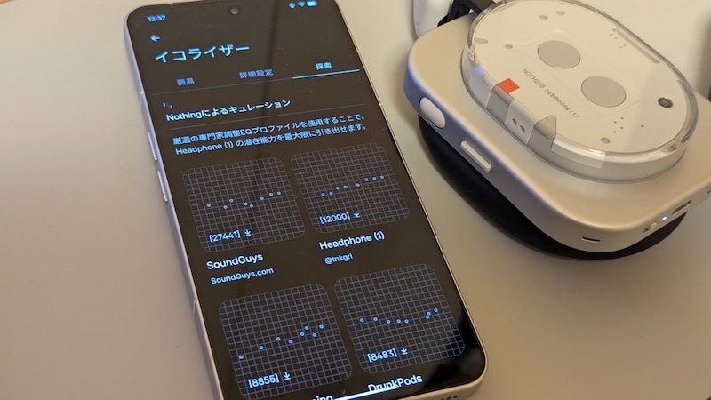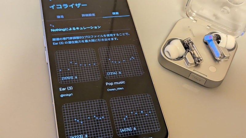 いずれもNothing Xアプリのイコライザーから好みのサウンドに調整が可能。Nothingらしい最近のアップデートとして注目できるのは、ユーザーが作成したイコライザープロファイルをダウンロードして使えるようになったこと。イコライザーの「探索」タブをタップすると、「Headphone (1)」「Ear (3)」といったデバイス向けのイコライザー設定や、「Pop Music」「Anime Melody」といった、ユーザーが独自に設定したイコライザー設定が利用できます。
