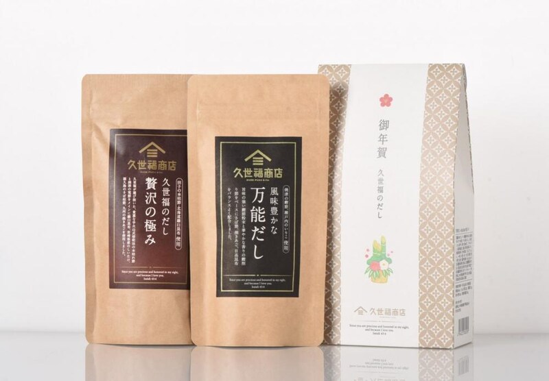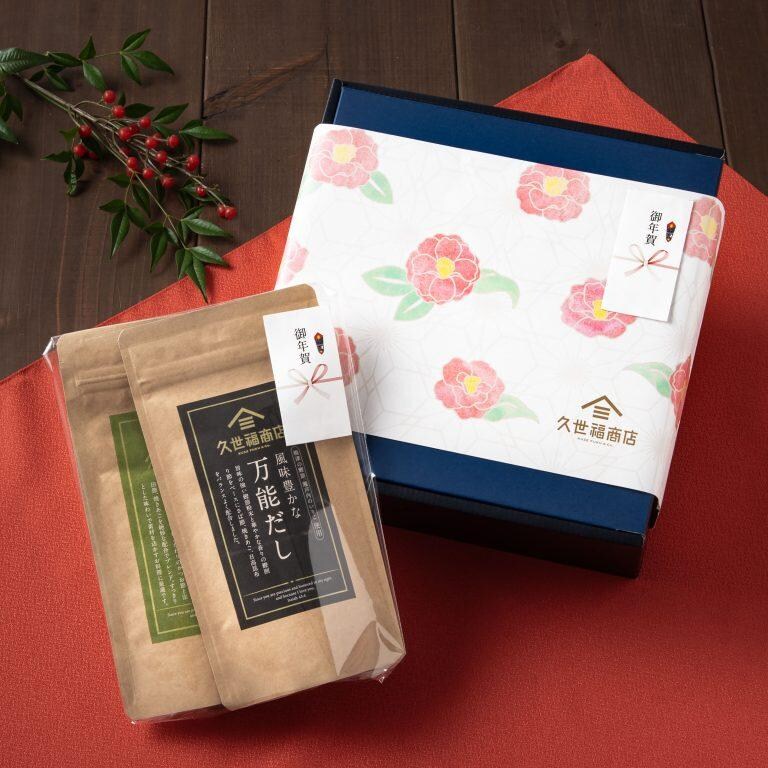 久世福商店の看板商品「風味豊かな万能だし(5包)」と、バイヤーが厳選した国産風味原料で作った「久世福のだし 贅沢の極み(5包)」が入っています。お雑煮やお鍋、おでんなど、様々な料理に使用できます。