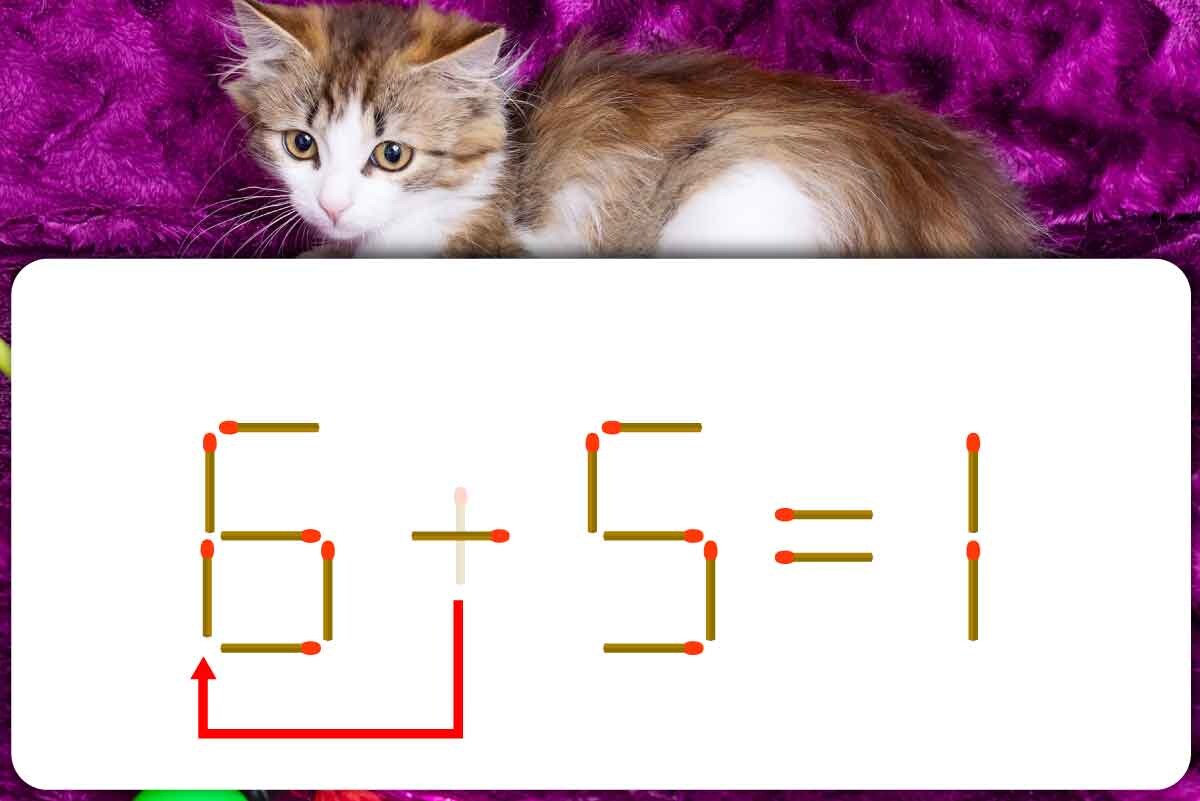 まず記号の「+」から、縦向きのマッチ棒を取り記号を「-」にします。抜き取ったマッチ棒を左にある「5」の左下に足すことで「6」へと早変わり!式が「6-5=1」になるため、数字と数字を足すのではなく、引くことで式が成立します。